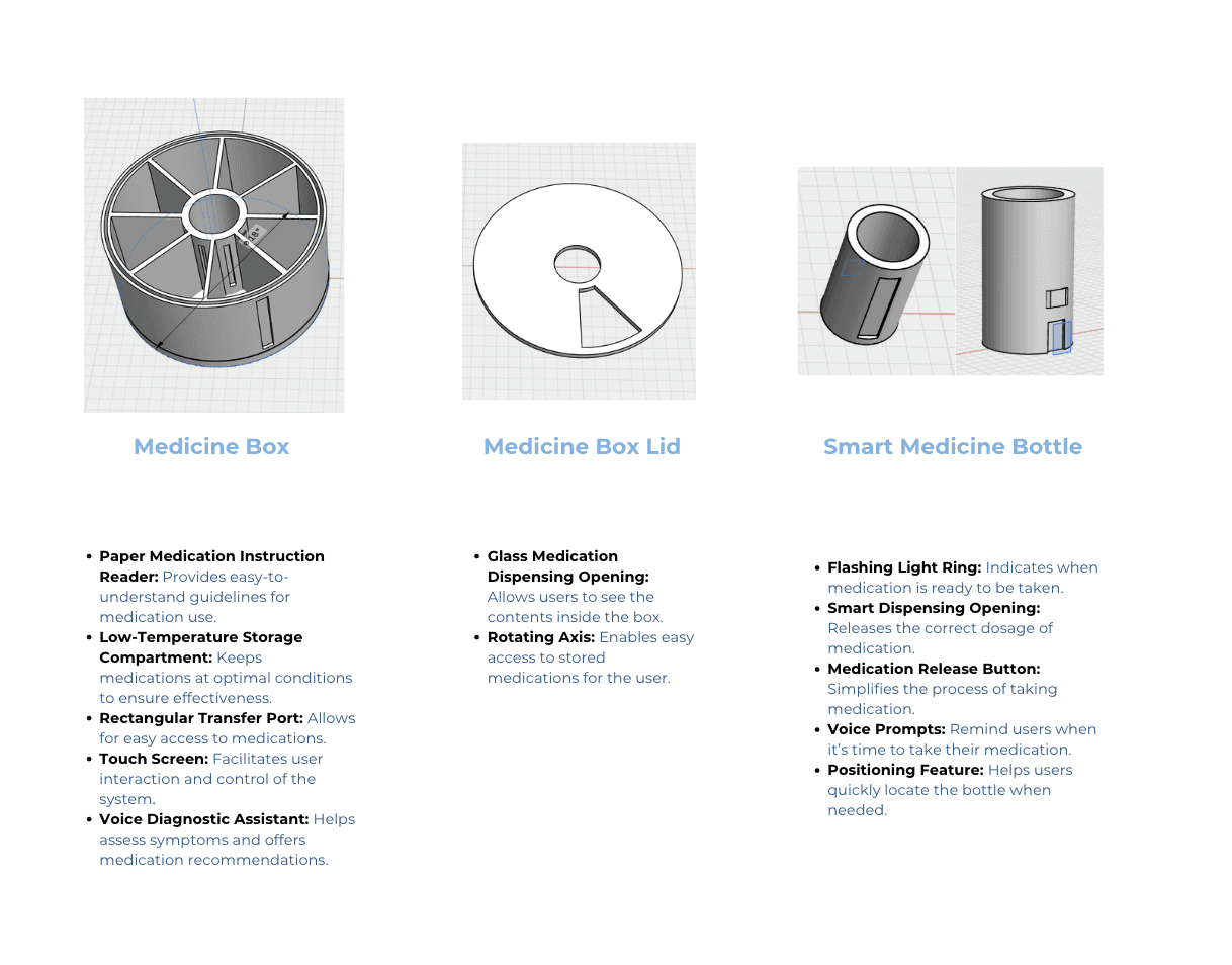 Medicine containers included with the box, designed for easy carrying and convenience. These containers will hold medications recommended based on current symptoms and dispense them as needed. The small containers built-in voice notification features.